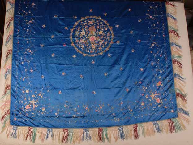 17-18世纪,有大量的中国外销品传入欧洲,特别是大量得丝绸织物被当做壁挂装饰在墙上,该件物品以蓝色素缎为地,由色彩比较柔和的多种丝线绣成,呈方形状,中央绣以孔雀、凤凰、牡丹、莲花及各种小花组成的五彩花鸟纹为中心,并有一圈滚动得小花围饰呈徽章形,四边为滚动的缠枝花装饰,边缘处为五彩丝线分别制成的流苏装饰。