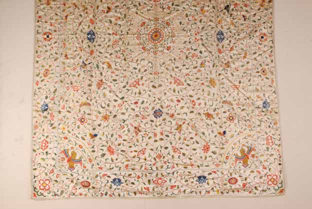 清外销白缎地彩绣缠枝莲花鸟纹被单