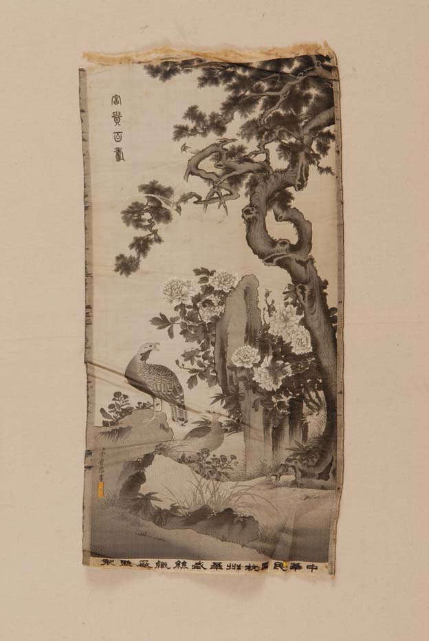 通过变化织物组织的方法获得层次分明的效果,使织物表面显示出与照片或画片上同样生动的人物或景物的此类丝织物,就是像景。一般有黑白和彩色两种。此为黑白像景,表现的是“富贵百寿”的景色,盛开的牡丹寓意富贵吉祥,苍劲的松树则象征的长寿。像景由中华民国杭州华盛丝织厂监制。
