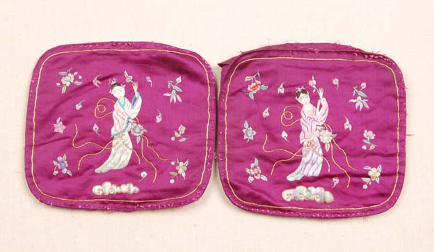 枕顶俗称“枕头堵”,是指绣着吉祥纹样的枕顶绣片。这是一对枕顶,均以紫色面料作底,上绣天女散花的纹样。“天女散花”又叫“仙女散花”,寓意春满人间,吉庆常在。原为佛教故事,天女散花以试菩萨和声闻弟子的道行,花至菩萨身上即落去,至弟子身上便不落。该绣品针法以平绣为主,辅以钉金绣。