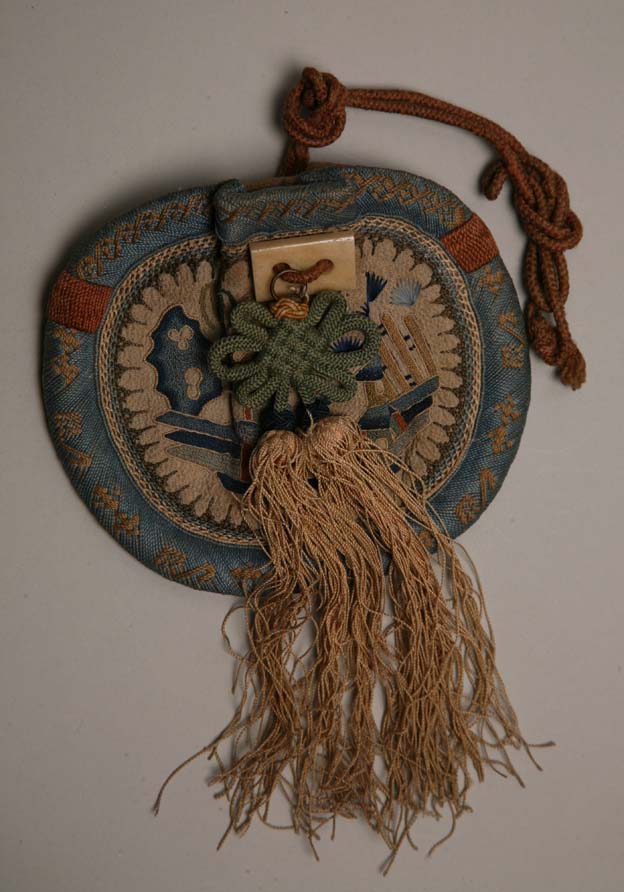 该荷包呈圆形,其上留有系带。荷包以白色绸作为主要面料,其上用打籽绣的刺绣技法绣出地景图案。荷包正面缀有一以绿线打成的盘长结,下垂浅黄色丝质流苏,上方还有一方形玉饰件。