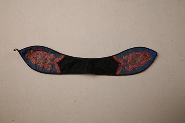 该绣品为眉勒。所谓眉勒是一种中间宽两头窄的长条带子,戴在额眉之间,借以防止额头发丝零乱的头饰。明清时期广为流传。在雍正十二妃图轴中,就有两位美人头戴眉勒。此眉勒中央为黑色缎地,两旁为宝蓝万字绸,其上平金绣花卉纹样。
