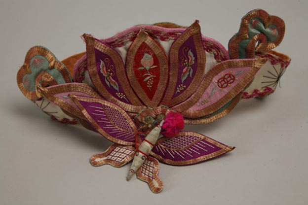 描述:该童冠饰用大红、紫色等五彩缎贴绣成莲花样式。其上彩绣花蝶纹样。因使用贴绣的方法,因而具有较强的立体感。