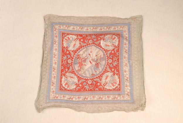 该织物为一块彩色印花戏出棉手帕,方形。红色地上,印有满地花蝶纹样。四角各一个团窠形图案,中央一大团窠纹样。纹样生动,色彩艳丽。