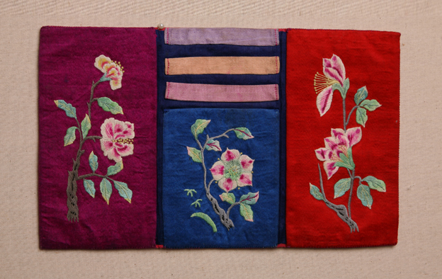 描述:该绣品为一钱包,长方形。面料采用红、黄、蓝等彩色缎。并在蓝缎上彩绣花卉纹样,所用针法以平针为主。