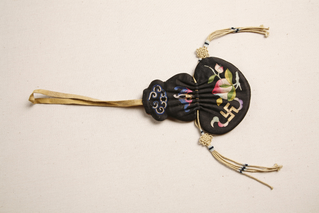 描述:此为一香袋,以青色素缎制成,一端有黄色系绳,其上用各色绸缎以堆绫绣的技法绣出桃子及万字纹样,意为“万寿”,两侧各有一黄色穗子装饰。