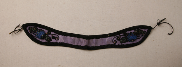描述:该绣品为眉勒。所谓眉勒是一种长条带子,戴在额眉之间,借以防止额头发丝零乱的头饰。明清时期广为流传。在雍正十二妃图轴中,就有两位美人头戴眉勒。此眉勒中央为藕合绸地,上有贴花,四周镶有黑色花边。