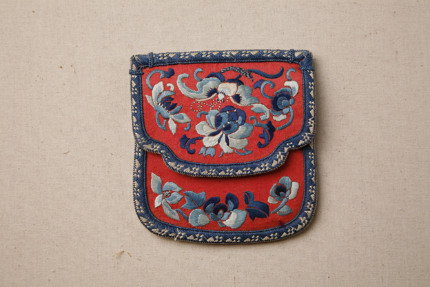 描述:该绣品为一钱袋,制成方形。主体面料采用红色素缎,其上三蓝绣花蝶纹样。钱袋周围镶有蓝黄结合的小绦带花边。