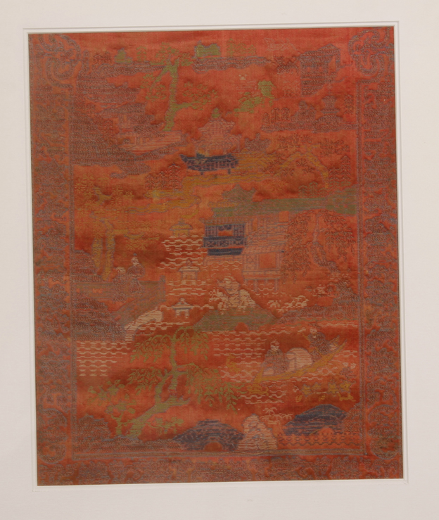 描述:该织物为一风景织锦。“锦,金也,作之用功重,其价如金,故唯尊者得服之。” 织锦,自古就是高贵的织物。该风景织锦表现小桥流水,游人泛舟的江南风景。