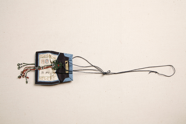 描述:此件为一烟荷包,以白色素缎为主要面料,其上以彩色丝线绣以图案,一面为地景纹样,另一面为诗文。并有系带及中国结装饰。