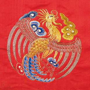 大红缎地团凤盘金绣