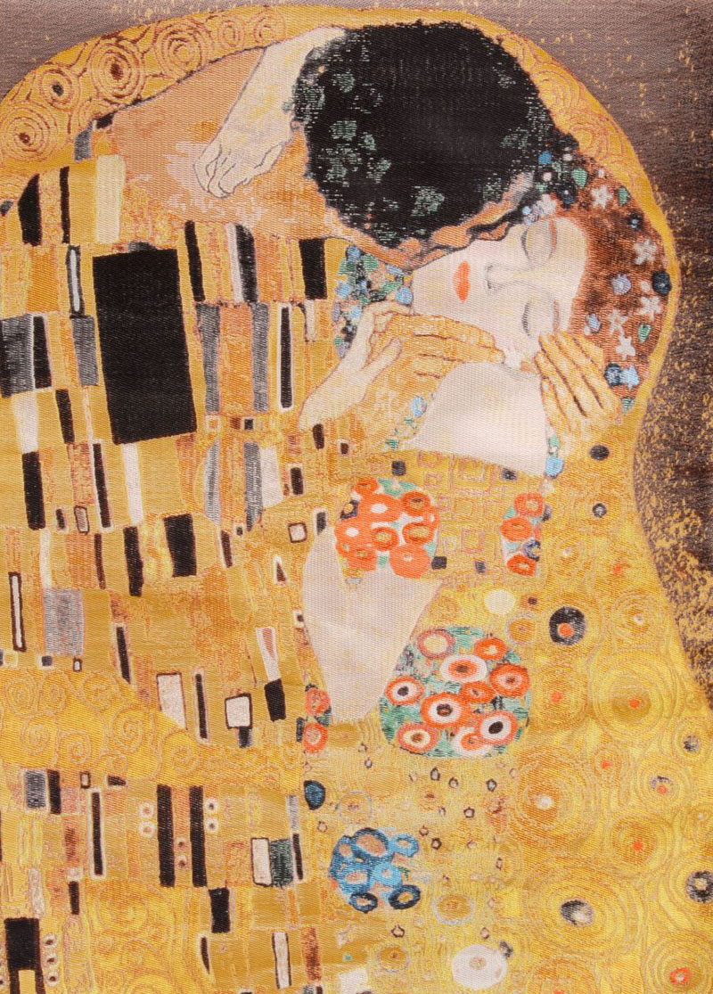 此幅五彩织锦以奥地利表现主义大师克里姆特的名作《吻》为蓝本,通过组织结构的变化和多种色纬的综合运用,忠实地勾画出原作的色彩和线条