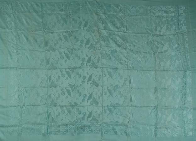此被面从杭州民间征集。被面面料为湖蓝地暗花绸,纹样为鸳鸯戏荷,图案淡雅高洁,为婚庆嫁妆,可能是建国初期丝织产品。被面上织有“鸳鸯戏荷,锦孙出品”及“完全真丝”字样。此件被面珍贵之处在于配有原装纸盒和包装纸,提供有关制造商、商家、商标等信息。对研究杭州50年代时期丝织业及丰富我馆杭州现代丝织产品具有现实意义。