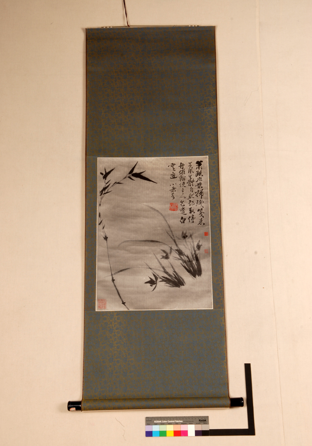 描述:此幅丝绸画已以画轴形式装裱,表现的是一幅墨兰作品。由杭州凯地丝绸有限公司展览后赠送。