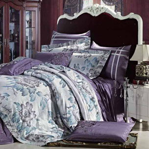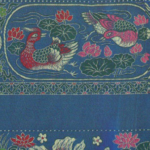当代湖蓝暗花绸鸳鸯莲池戏荷被面